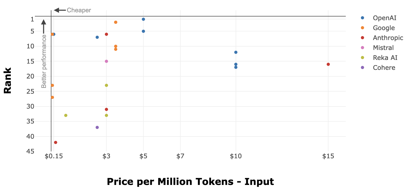 차트의 왼쪽으로 갈수록 API 사용 가격이 저렴한 것이고, 차트의 위로 올라갈수록 성능이 높아진다. 지난번의 포스트에서 살펴본 바와 같이 현재 성능 1위는 ChatGPT 4o 모델이다. 그러나, ChatGPT 4o 모델의 경우 인풋 가격이 1M 토큰당 $5, 아웃풋 가격이 1M 토큰당 $15로 꽤나 비싼 편이다. 성능 순위 2위인 Gemini 1.5 Pro의 경우, 제한된 테스트 사용의 경우에는 무료이지만, 그렇지 않을 경우 인풋 가격 $3.5 (1M 토큰당), 아웃풋 가격 $10.5 (1M 토큰당)로 챗지피티 4o 모델보다는 저렴하지만, 그래도 여전히 꽤나 비싼 편이다.